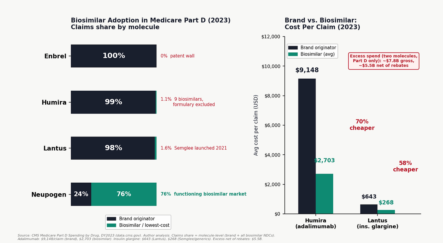 The gross excess spending from brand lock-in on just these two molecules (adalimumab and insulin glargine) in Medicare Part D alone: approximately $7.8 billion per year. Net of estimated rebates: approximately $5.5 billion. That is from two molecules, in Medicare alone, in one year.