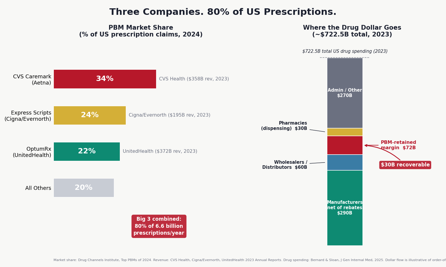 Together: 80% of the 6.6 billion prescriptions Americans fill annually. Drug Channels Institute's 2024 market share analysis shows that the remaining 20% is split among a second tier of smaller PBMs (Humana Pharmacy Solutions, Prime Therapeutics, MedImpact) plus a modest and growing segment of independent, "pass-through" PBMs operating under full transparency.