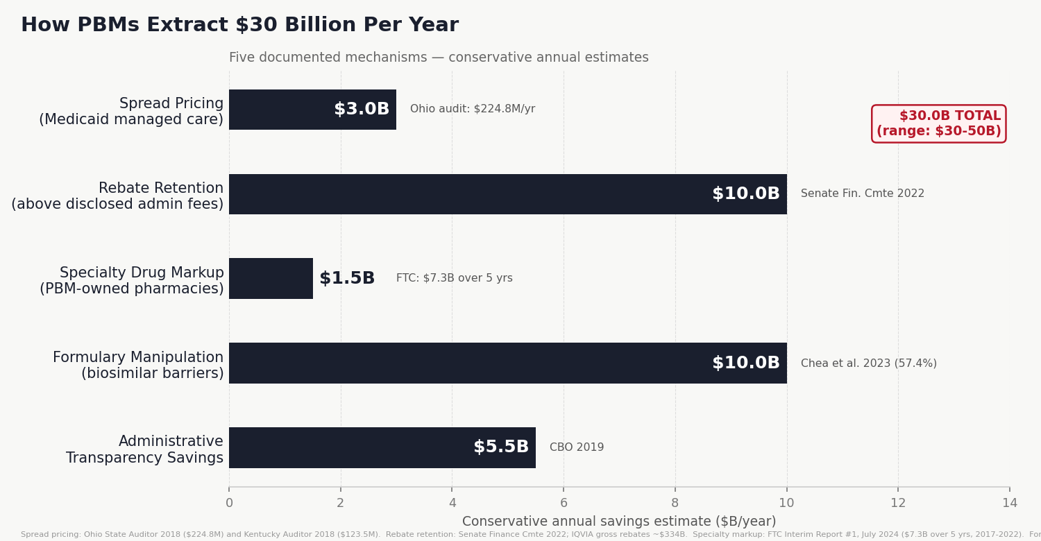 The methodology here is conservative by design. The $30 billion books the low end of a range that many independent analyses place at $40–50 billion. Each of the five mechanisms is documented by a distinct source: the Ohio state auditor (spread pricing), the FTC (specialty markup), the Senate Finance Committee (rebate retention), peer-reviewed analysis in JAMA Health Forum (formulary manipulation), and the CBO (administrative transparency). None of these mechanisms overlaps with the savings identified in Issues #1 through #3; they address a different layer of the supply chain.