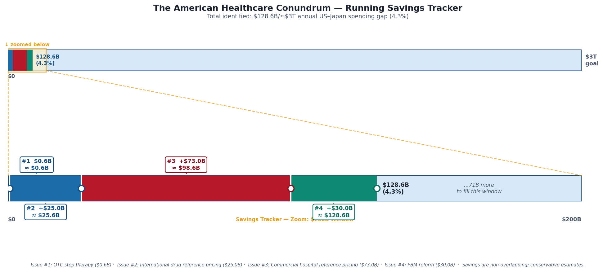 Savings Tracker: Running Total After Issue #4, $128.6 billion / ~$3 trillion (4.3%)