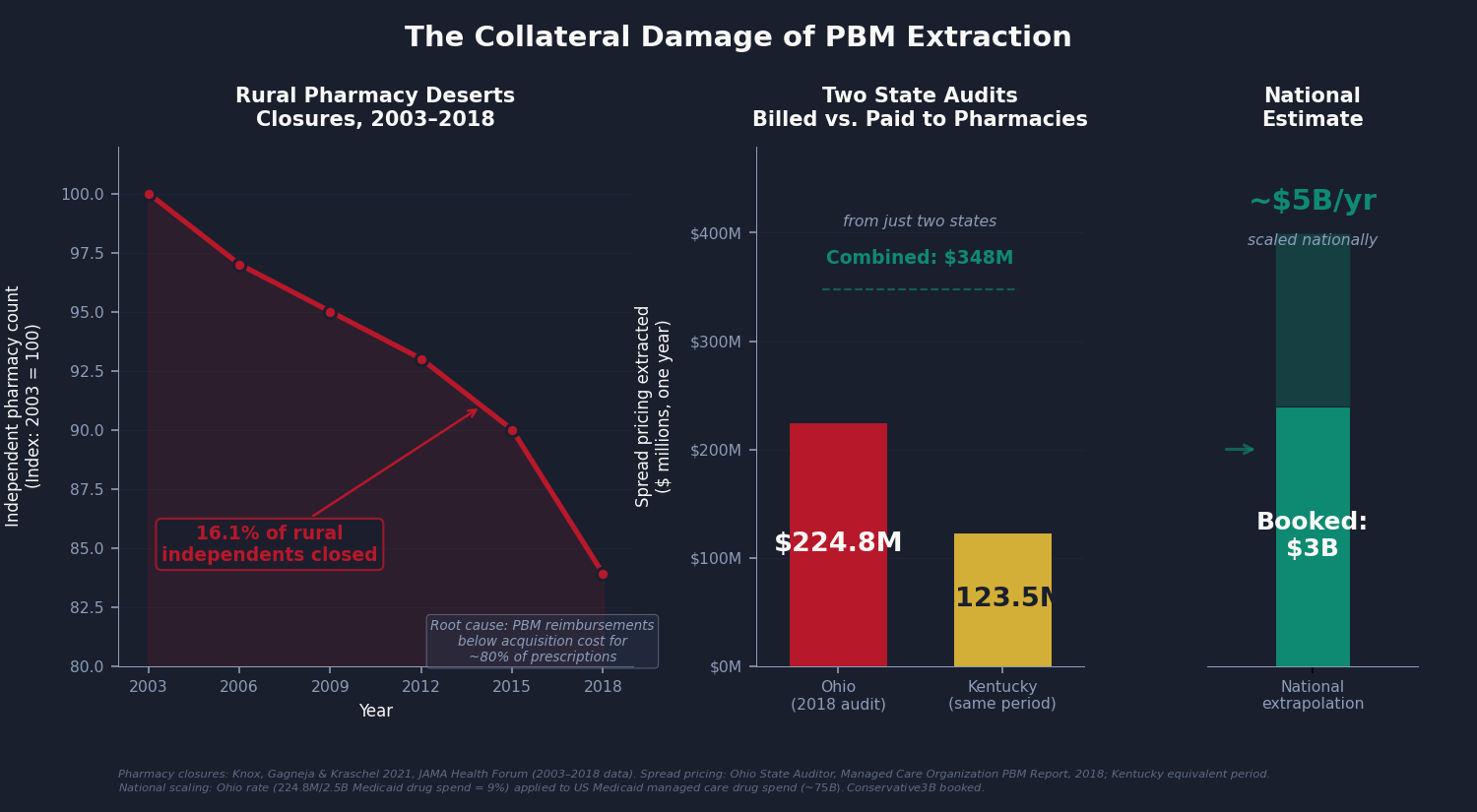 Rural pharmacy deserts do not have a dollar value that fits neatly into a savings model. But when the nearest pharmacy is 45 miles away, patients skip doses. Skipped doses produce hospitalizations. Hospitalizations cost money. The harm is real and it is downstream of the extraction documented above.
