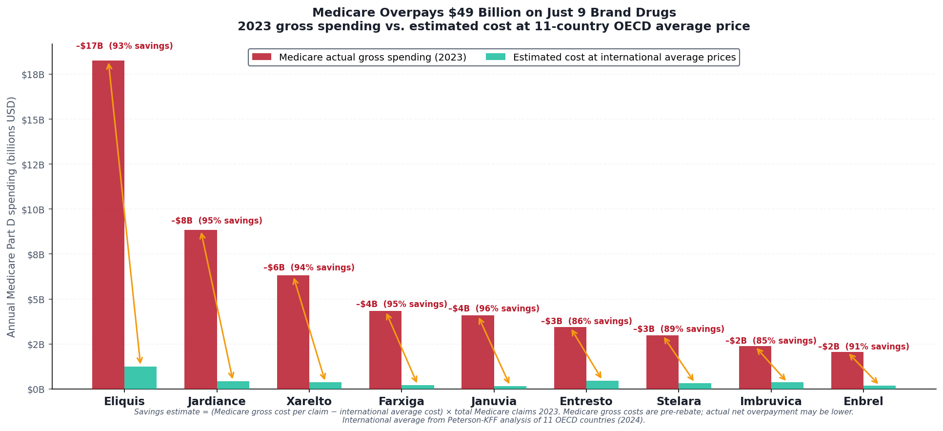 Applied to the 9 drugs in this analysis, at the 11-country OECD average price, the estimated savings to Medicare is approximately $25 billion per year — conservatively adjusted for rebates and net costs. That is not theoretical. It is the difference between what Medicare currently pays, and what every other wealthy government pays, for the same molecules.