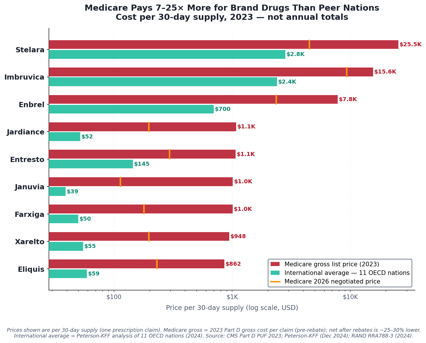 The conservative figure accounts for manufacturer rebates — payments from drug companies back to Medicare Part D plans that reduce the net cost below the gross figures in public data. CMS publishes gross spending by drug, but individual rebate amounts are legally protected as trade secrets under contracts between manufacturers and pharmacy benefit managers. No public dataset shows the exact net price of Eliquis or Jardiance. So we triangulate. MedPAC — Congress’s independent advisory body, which has statutory access to confidential rebate data under the Consolidated Appropriations Act of 2021 — reports that aggregate Part D rebates reached approximately $70 billion in 2023, or 25 percent of gross spending. That average includes generics, which carry near-zero rebates. For brand drugs specifically, the rebate share is substantially higher: Feldman et al. (JAMA Health Forum, 2021) estimated brand-name Part D discounts at 37 percent as of 2018 and rising, with some therapeutic classes exceeding 50 percent. The $25 billion figure in this analysis applies a 49 percent net adjustment — consistent with CMS’s own gross-to-net reconciliation for top-spend branded products and with MedPAC’s brand-specific ranges. Even after that adjustment, the gap between what Medicare pays and what peer nations pay is measured in the tens of billions.