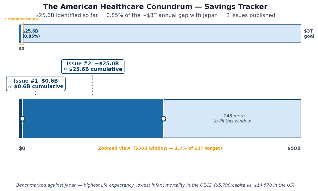 Savings Tracker — Running Total After Issue #2: ~$25.6 billion / ~$3 trillion (0.87%)