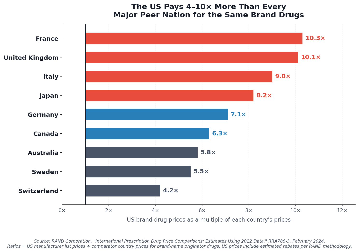 US brand-name drug prices are, on average, 10.3 times what France pays, 10.1 times what the United Kingdom pays, 8.2 times what Japan pays, and 7.1 times what Germany pays. The overall multiple across all countries is 2.78×. For brand drugs specifically, the ratio rises to at least 3.22× — and that accounts for estimated US rebates.