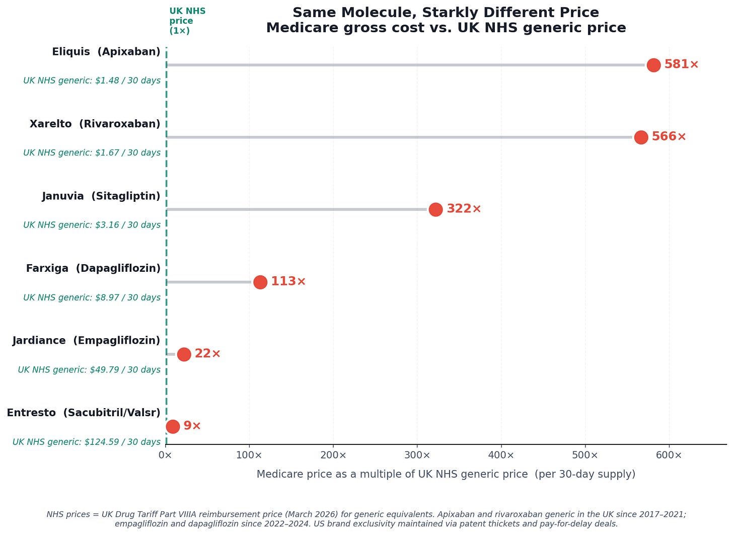 And that’s Japan. In the United Kingdom, apixaban has been available as a generic since 2017. The NHS reimburses pharmacies roughly £1.17 — about $1.48 — for a 30-day supply. In the US, Bristol-Myers Squibb and Pfizer have used a thicket of secondary patents and pay-for-delay settlements to block generic entry, so Medicare still pays the branded price: 581 times more for the same molecule.